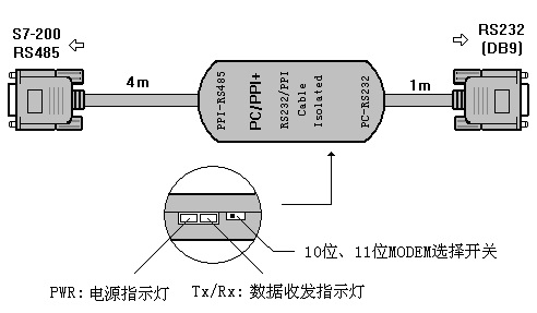 Optical isolation PC/PPI cable. Functions same as the above; Support 10-bit and 11-bit MODEM communication; With communication indicator; Baud rate: 0-115.2Kbps, self-adaptive; Maximum communication distance: up to 2km.